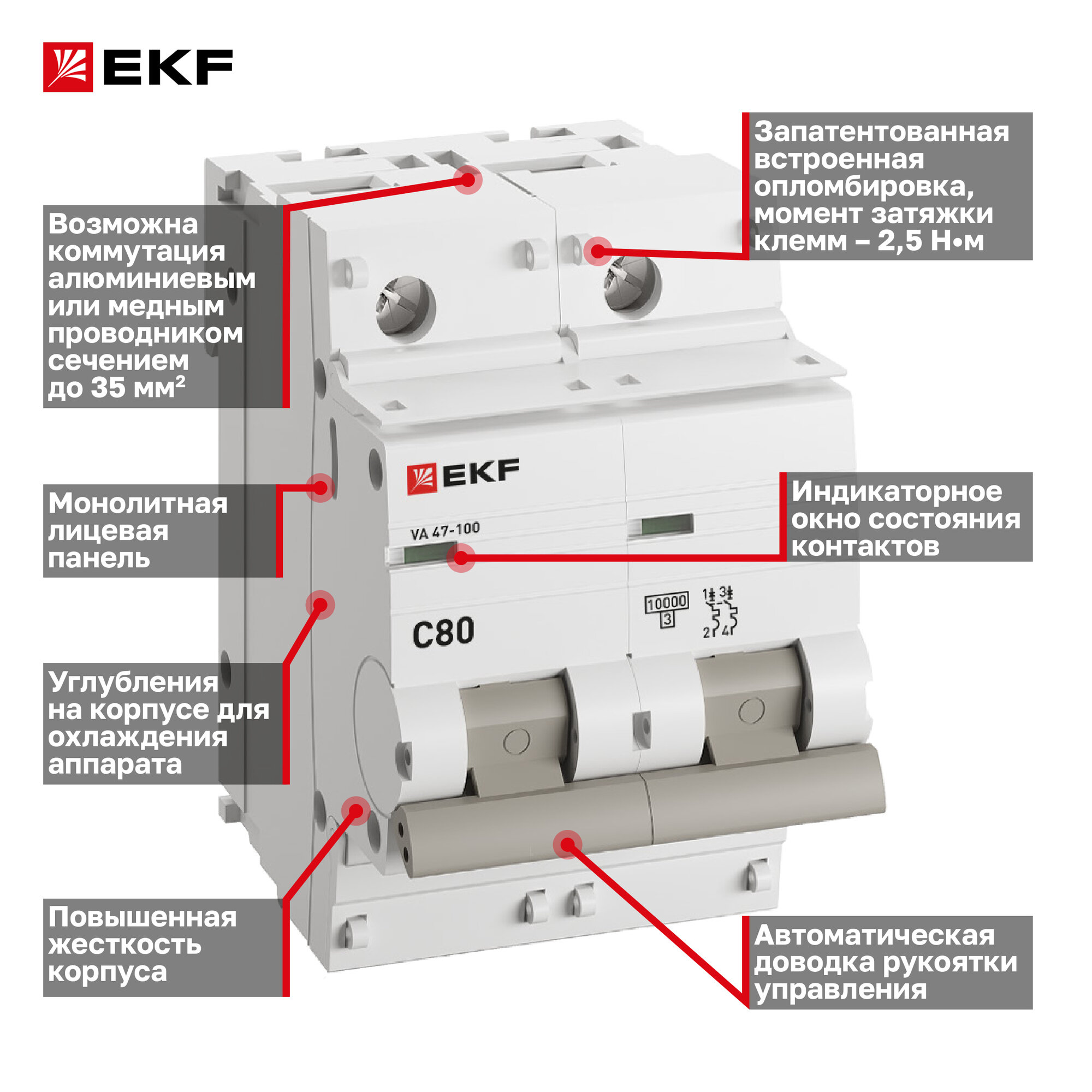 Автоматический выключатель 2P 80А (C) 10kA ВА 47-100 EKF PROxima информация: