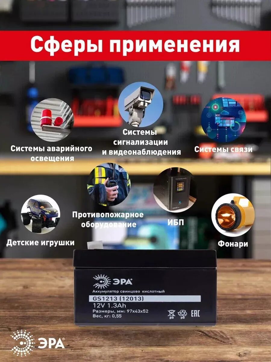 10 цен на Аккумулятор ЭРА GS1213, для ИБП, свинцово-кислотный, 12В, 1.3Ач