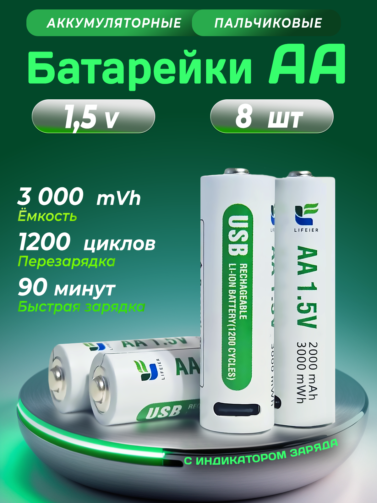 Аккумуляторные батарейки, AA, Li-Ion, 3000 mWh, с кабелем USB, 8 шт информация: