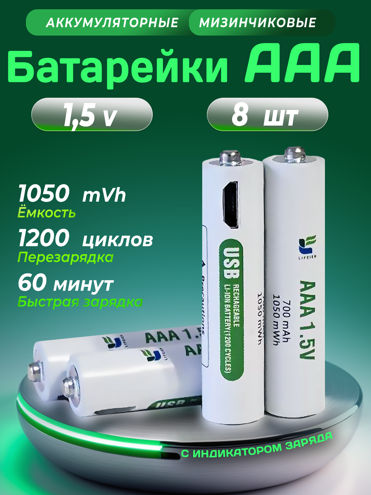 Аккумуляторные батарейки, AAА, Li-Ion, 1050 mWh, с кабелем USB, 8 шт информация: