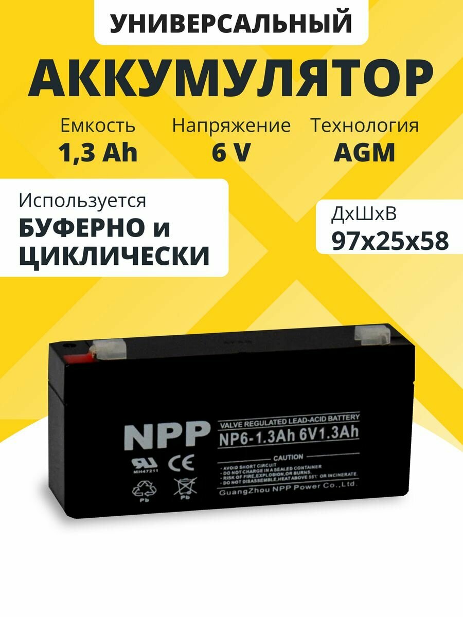 Аккумулятор 6v 1,3 Ah NPP AGM F1/T1 акб для игрушечной машины, весов 97x25x58 мм информация: