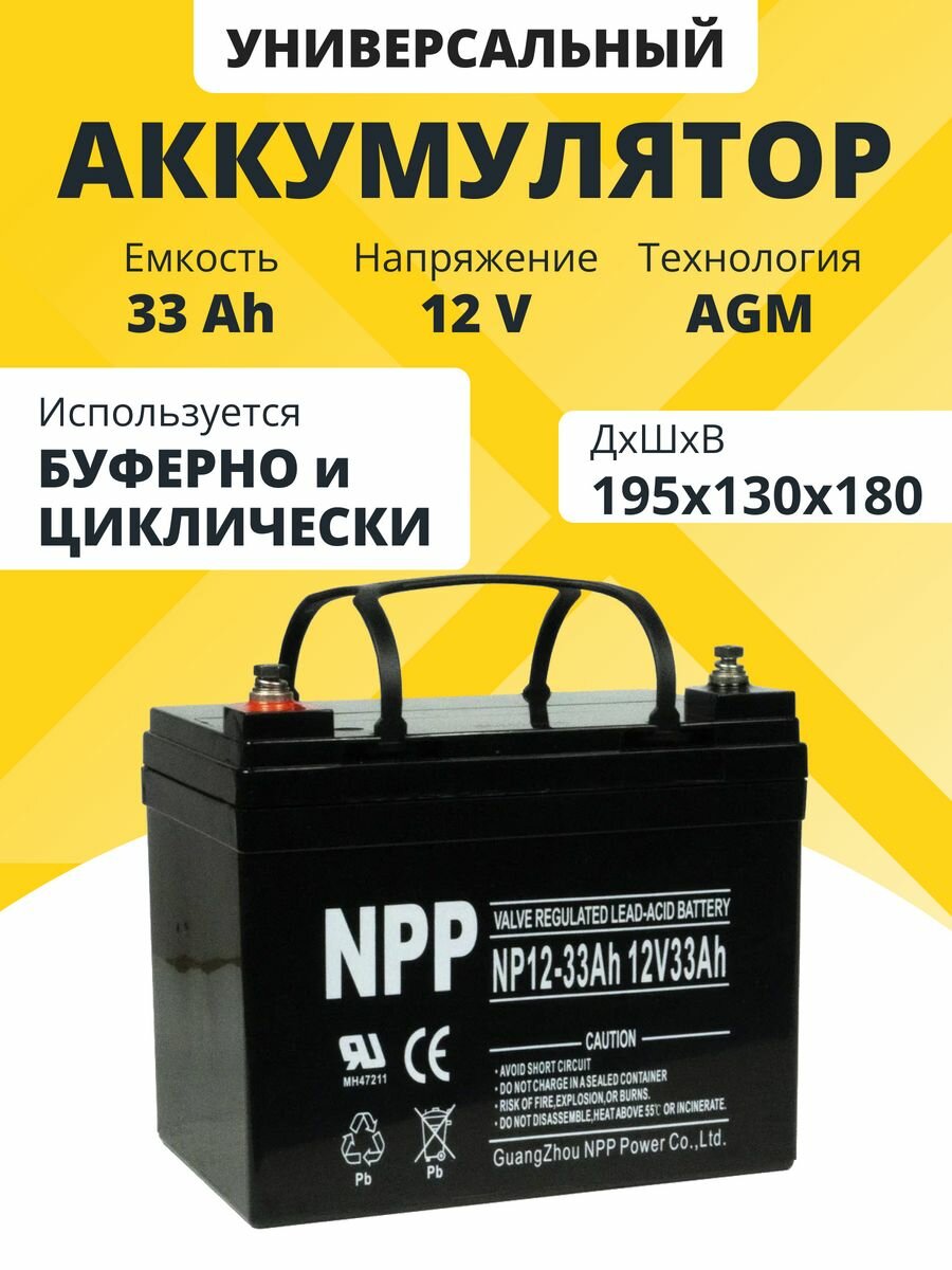 Аккумулятор для ибп 12v 33 Ah NPP AGM M6/T14 акб компьютеров, котлов 195x130x180 мм информация:
