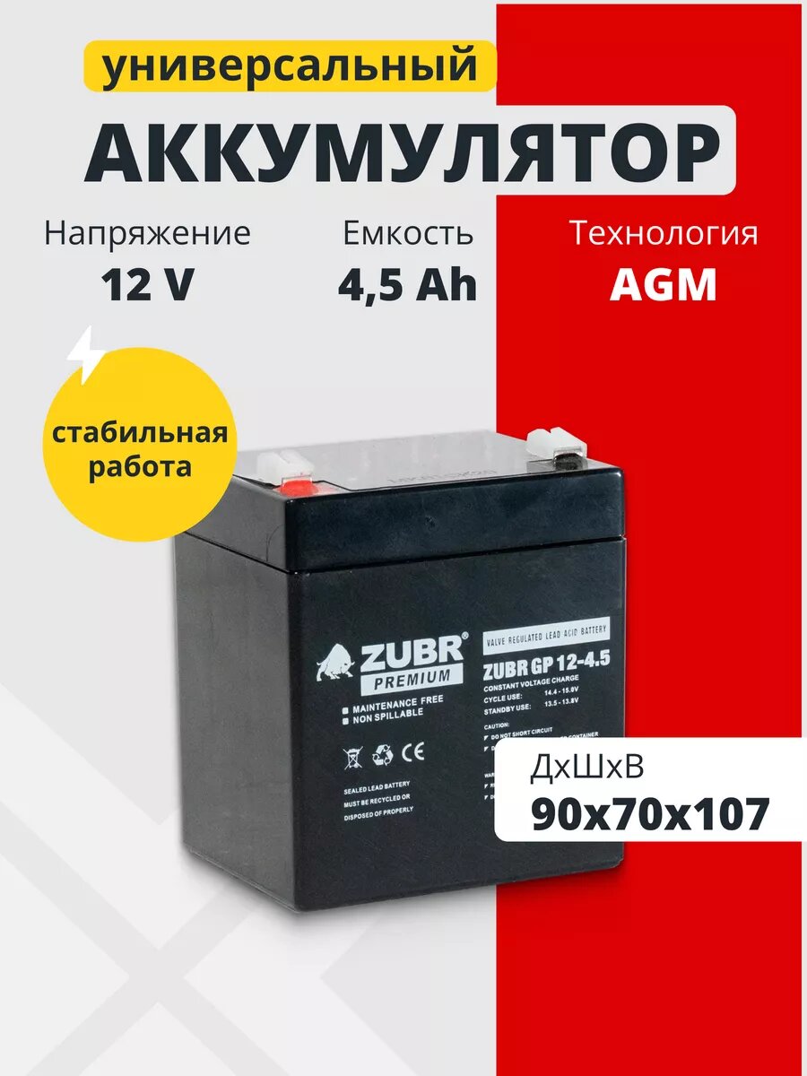 Аккумулятор для ибп 12v 4.5Ah ZUBR AGM F2/T2 детской машины, фонарика информация: