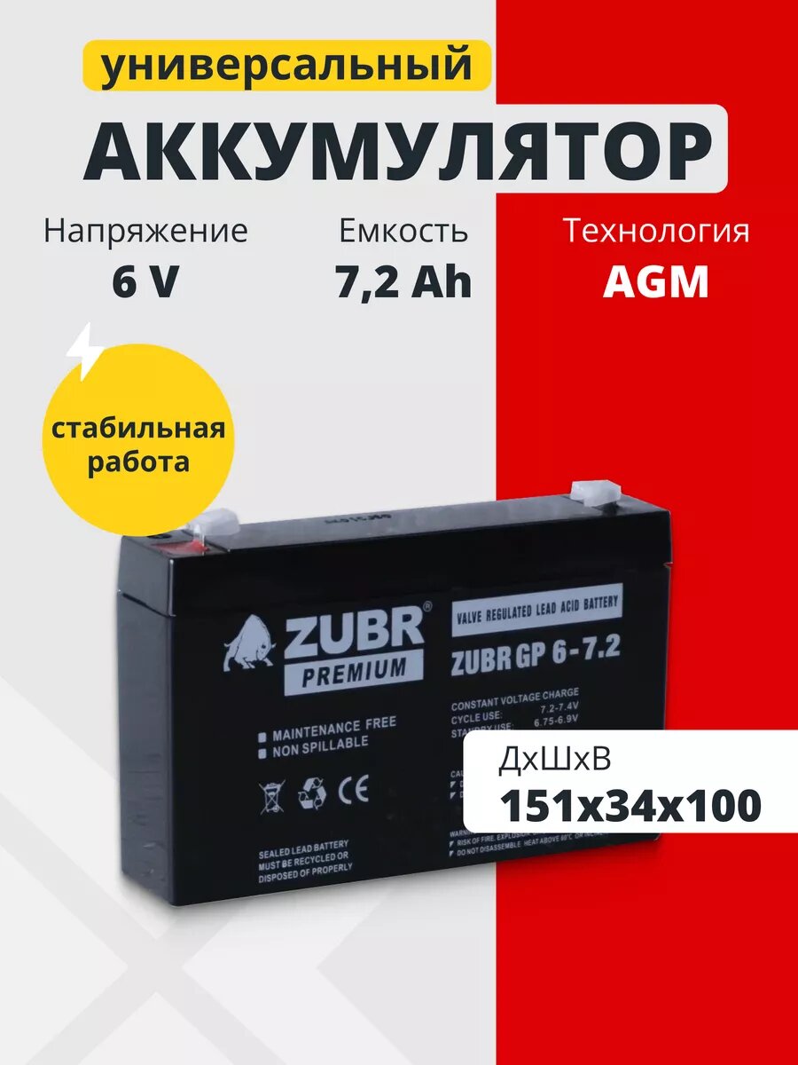 Аккумулятор для ибп 6v 7.2 Ah ZUBR AGM F1/T1 эхолота, фонарей, весов информация: