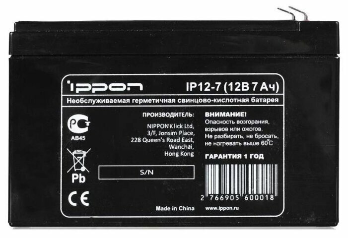 Аккумуляторная батарея Ippon "IP 12-7", 12В, 7Ач, 94.5х64.5х151мм, черный информация:
