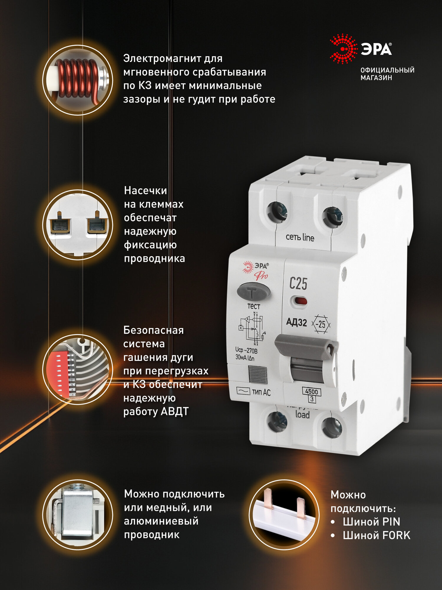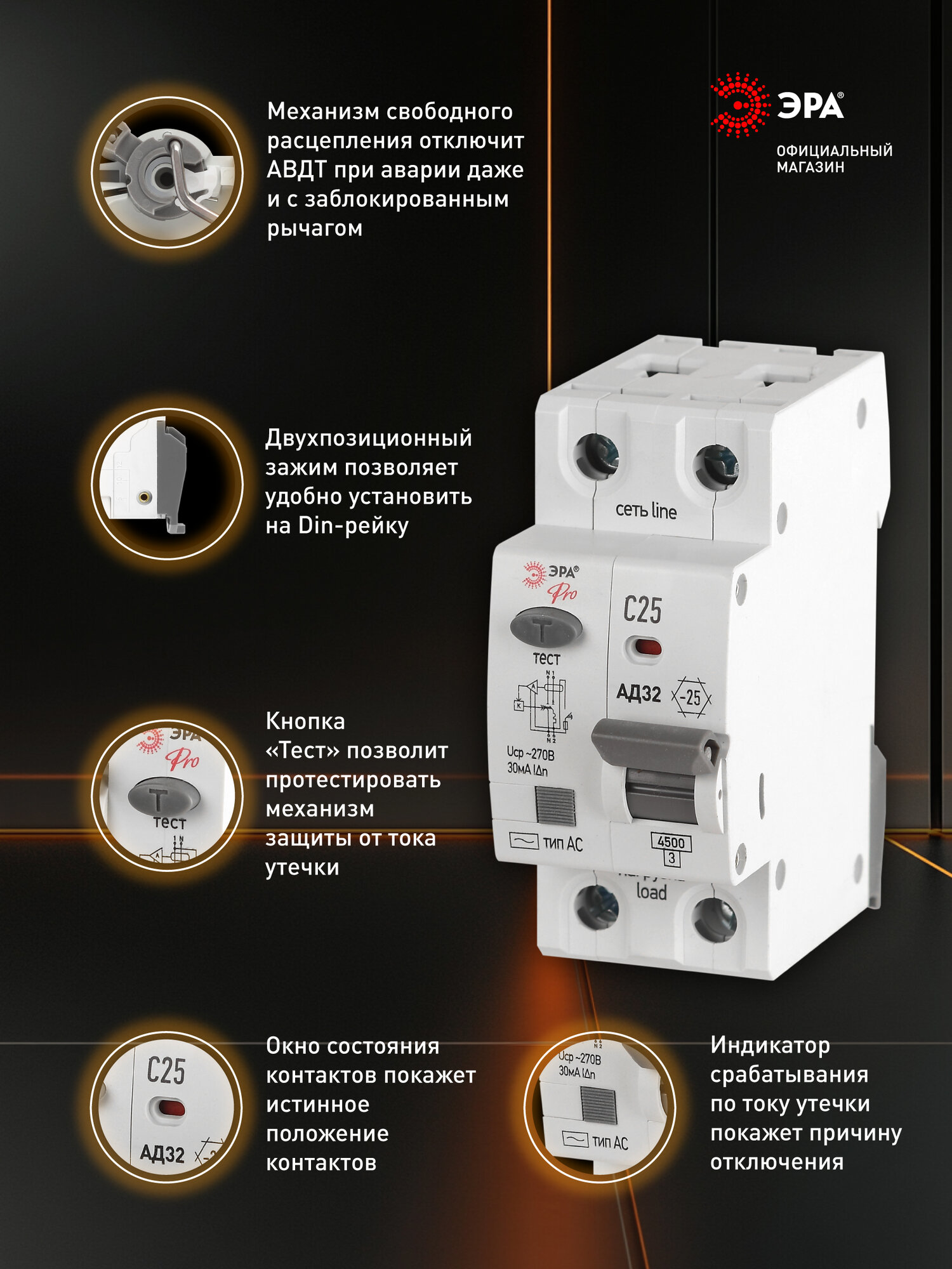 Автоматический выключатель дифференциального тока авдт 25а 30ма ЭРА PRO D32E2C25АC30P АД-32 электронное 1P+N C25 тип АC защита 230В 4,5кА информация:
