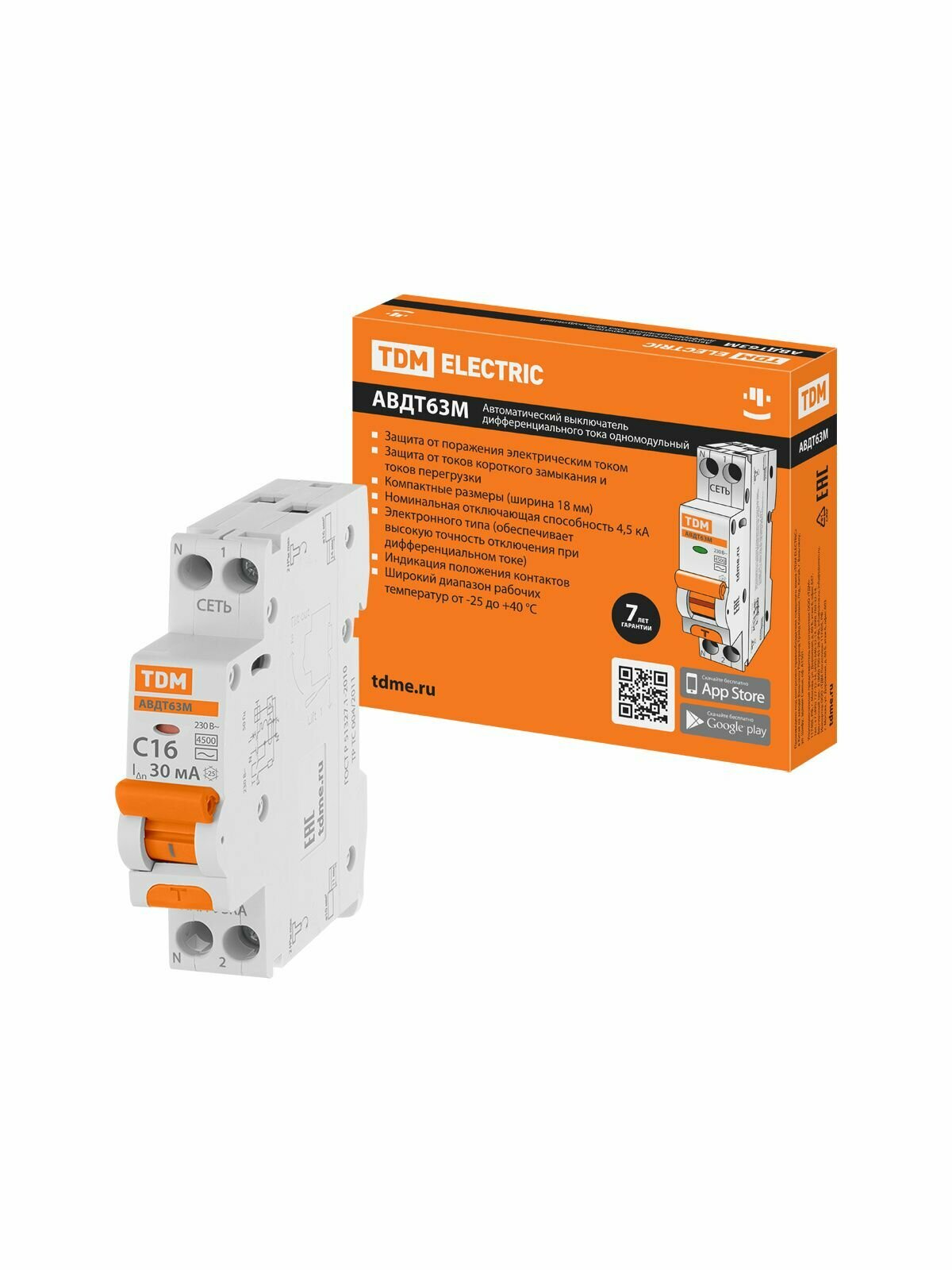ТДМ Дифференциальный автомат АВДТ 63 6кА, С 16А, 30мА, тип А, 1P+N