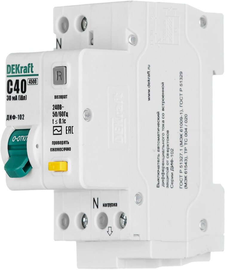 10 цен на DEKraft АВДТ 1Р+N 40А 30мА тип AC х-ка С ДИФ-102 нов. 4,5кА 16007DEK