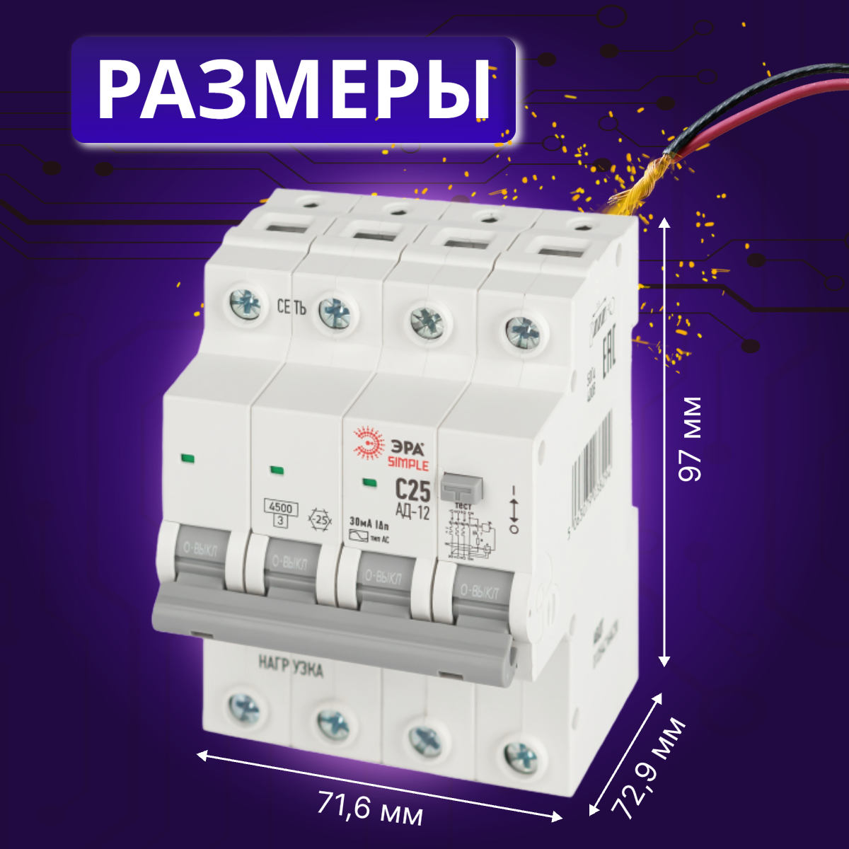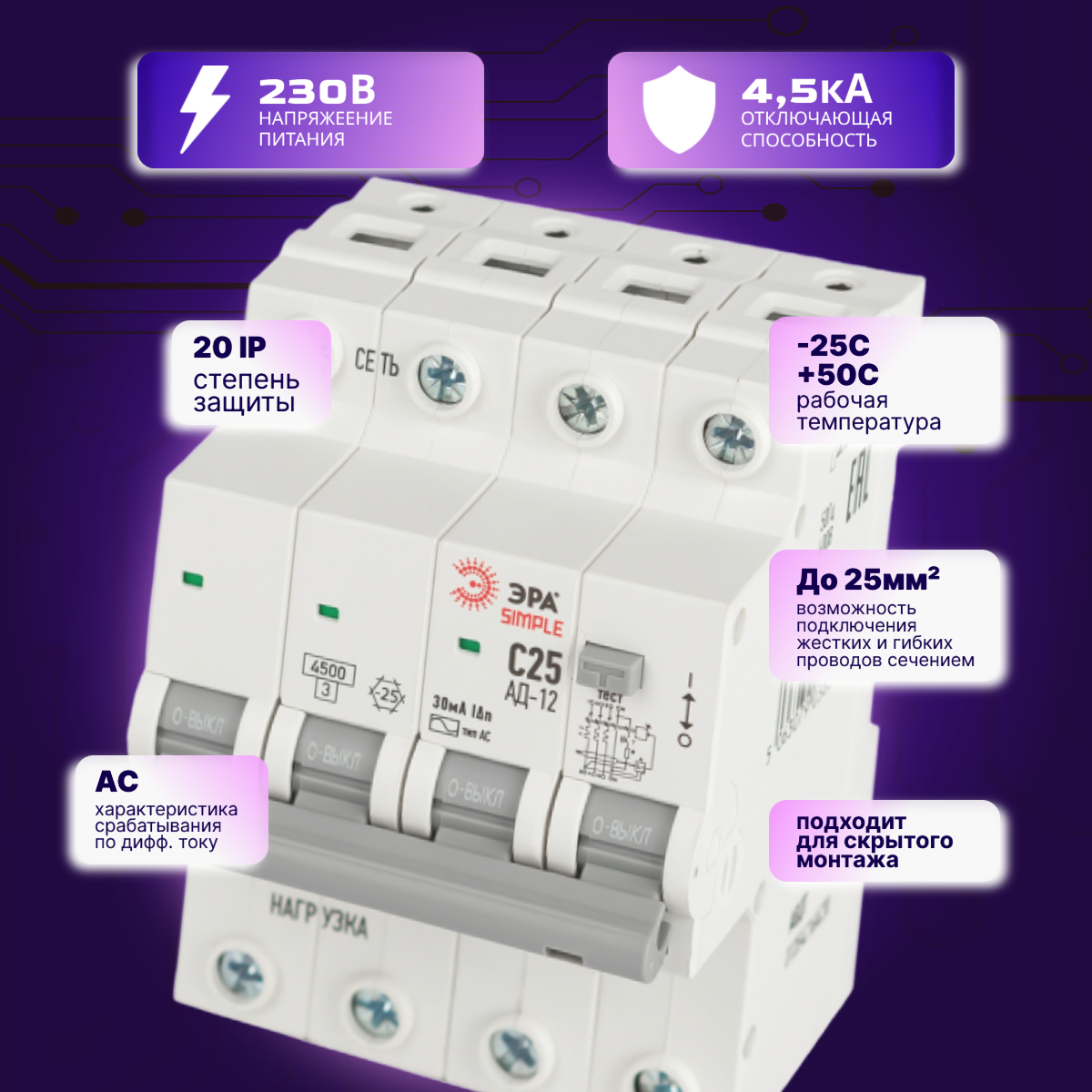 Дифавтомат 4P (3П+N) 25А 4.5кА 30мА C AC SIMPLE D12E4C25AC30 АВДТ АД-12 Б0058928 ЭРА 1шт информация: