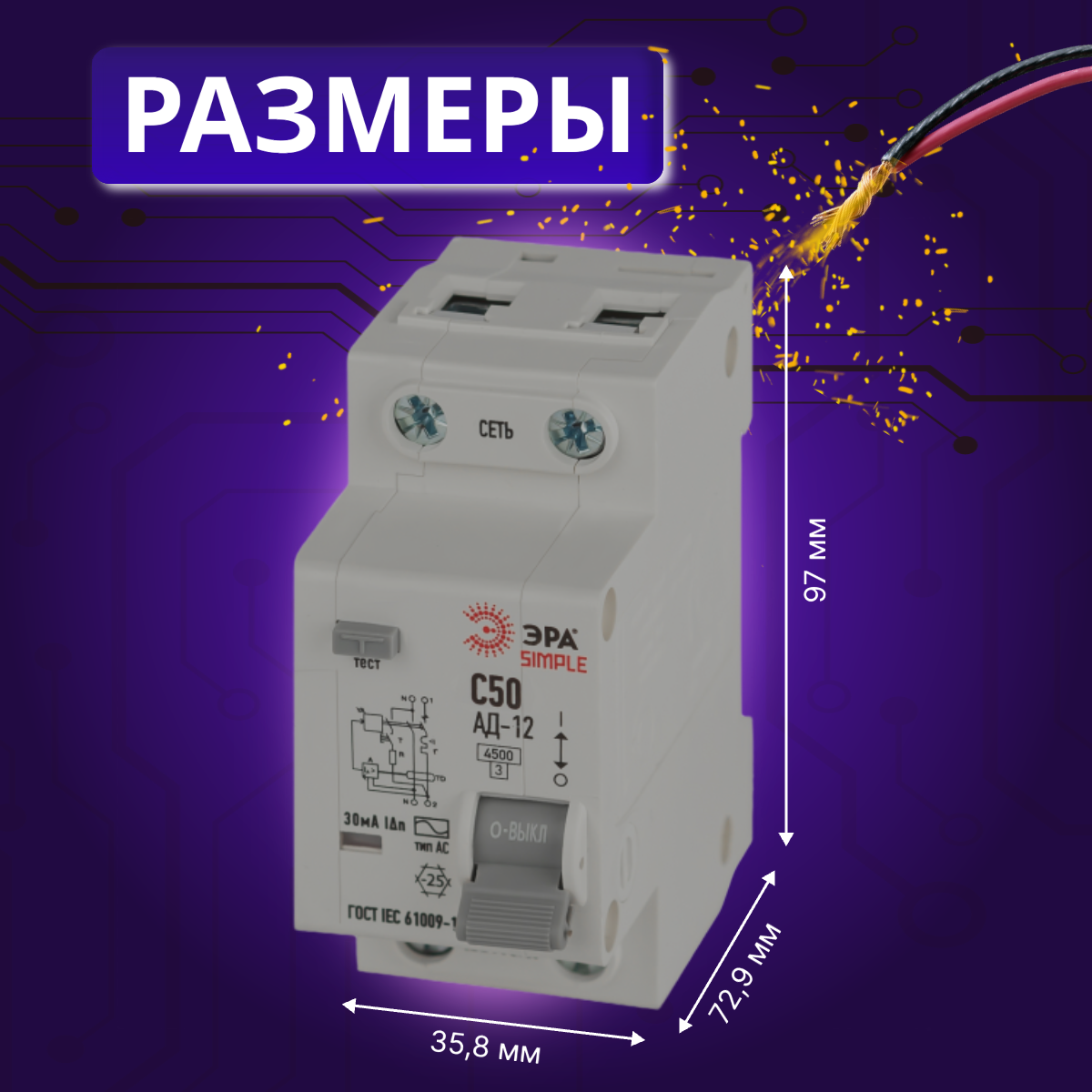 Дифавтомат 2P (1П+N) 50А 4.5кА 30мА C AC SIMPLE D12E2C50AC30 АВДТ АД-12 Б0058925 Эра 2шт информация:
