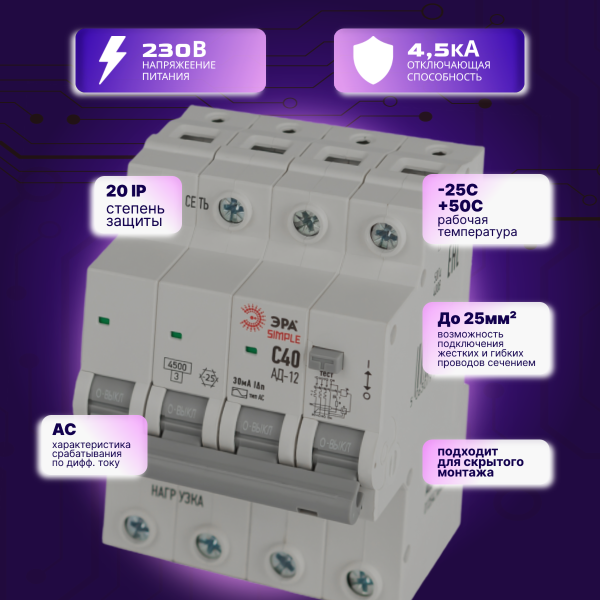 Дифавтомат 4P (3П+N) 40А 4.5кА 30мА C AC SIMPLE D12E4C40AC30 АВДТ АД-12 Б0058930 ЭРА 2шт информация: