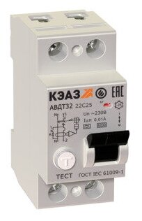 Выключатель автоматический дифференциального тока 2п C 25А 30мА тип A 6кА АВДТ32-22C25 A УХЛ4 КЭАЗ 228067