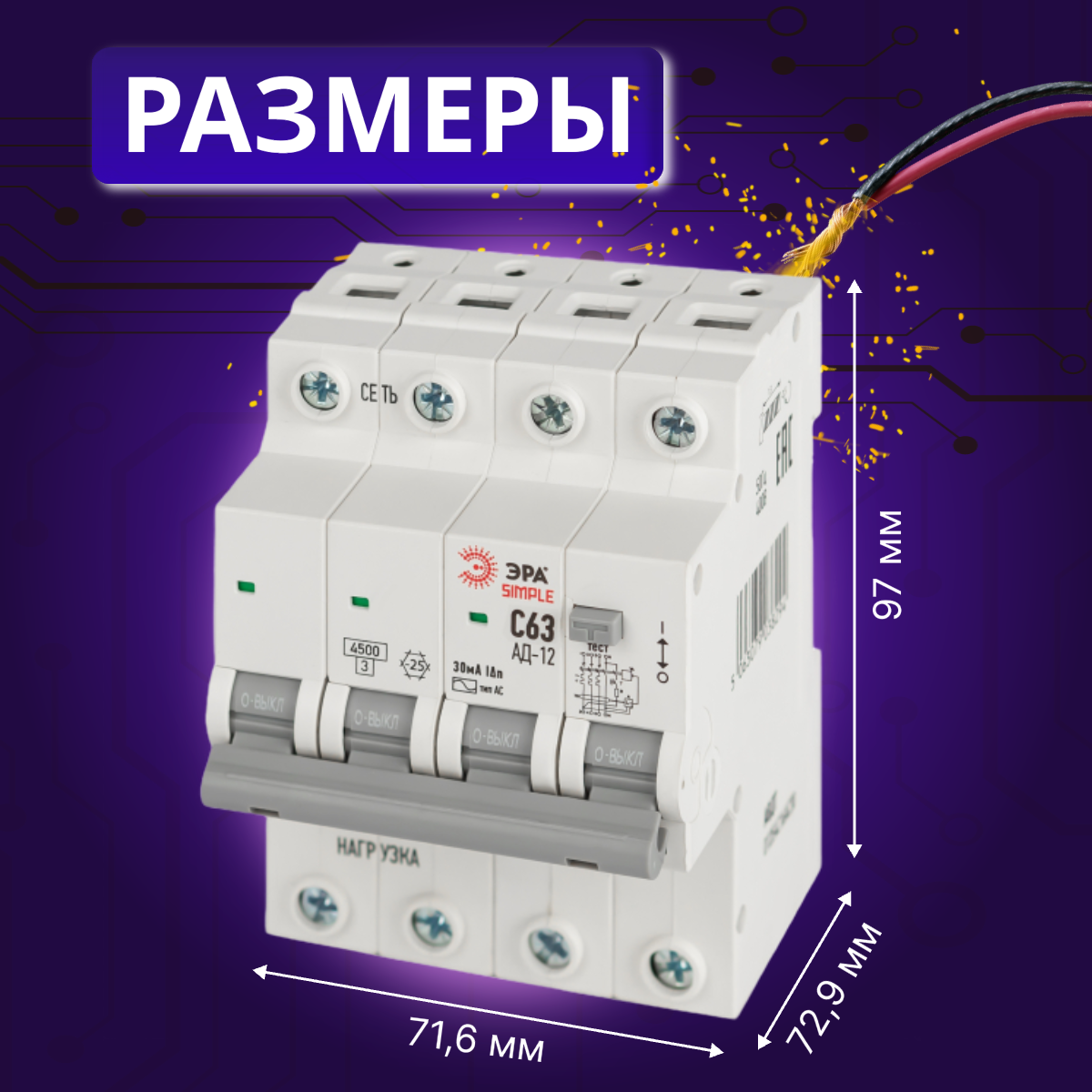Отзывы на Дифавтомат 4P (3П+N) 63А 4.5кА 30мА C AC SIMPLE D12E4C63AC30 АВДТ АД-12 Б0058931 ЭРА 1шт