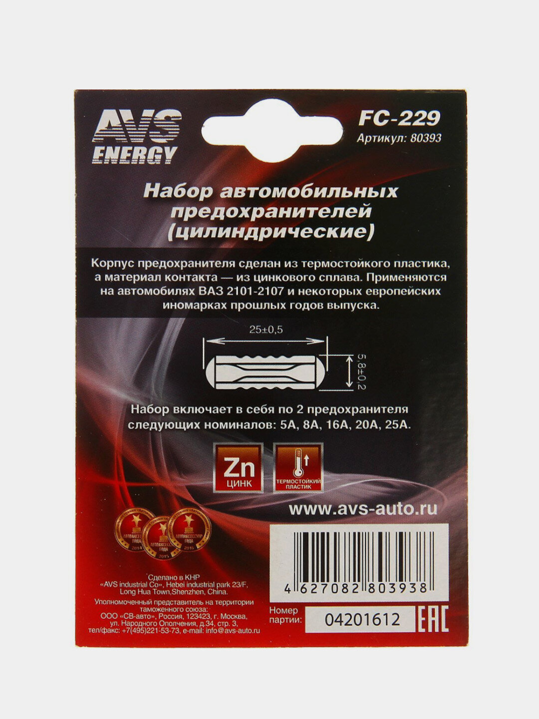 Набор предохранителей AVS "FC-229", цилиндрические, в блистере, 10шт информация:
