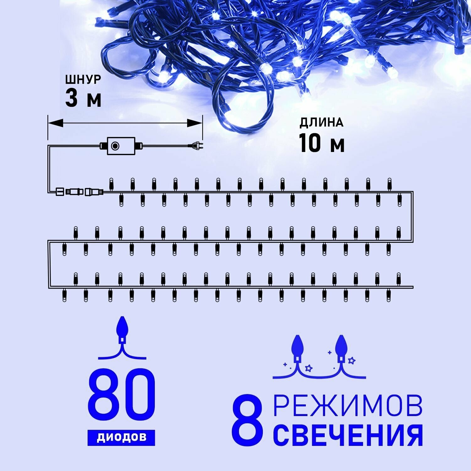 Электрогирлянда Neon-night Твинкл Лайт, 80 LED ламп, 8 режимов, зеленый шнур, 10 м, синяя