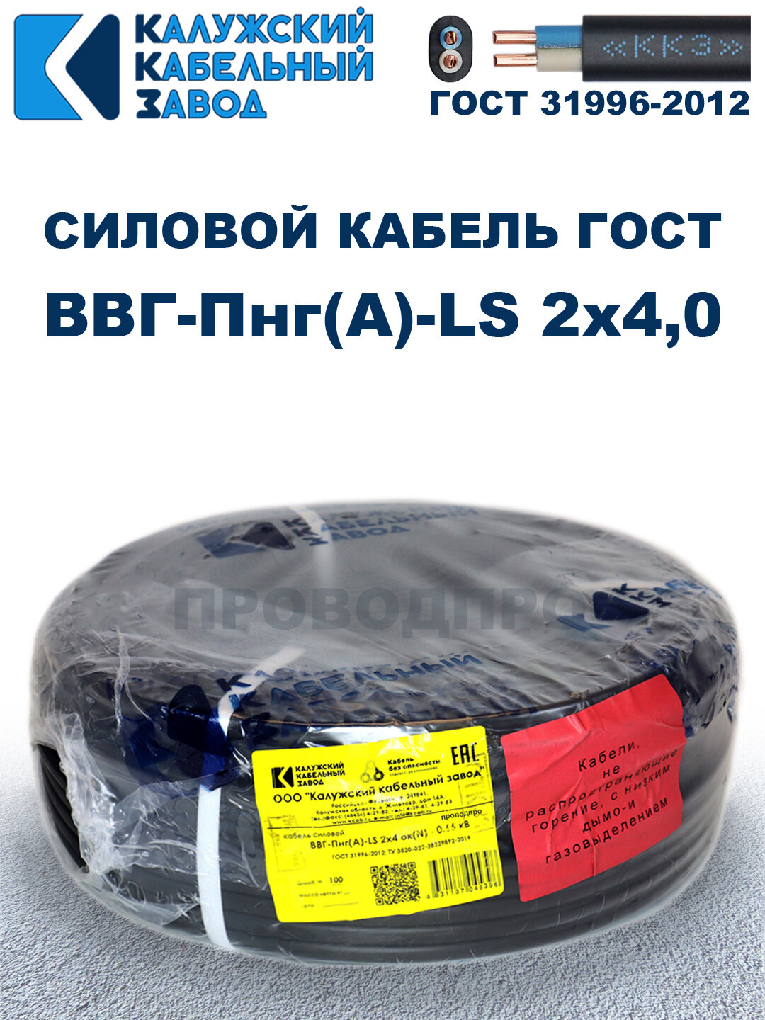 Кабель силовой ВВГ-Пнг(А)-LS 2х4,0 ГОСТ. 50 метров. Кaлyжcкий кабельный зaвoд информация: