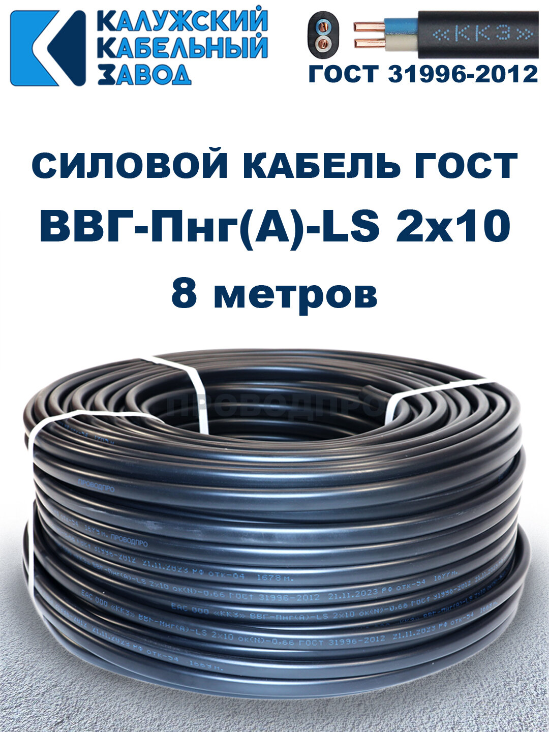 Кабель силовой ВВГ-Пнг(А)-LS 2х10 ГОСТ. 8 метров. Кaлyжcкий кабельный зaвoд информация: