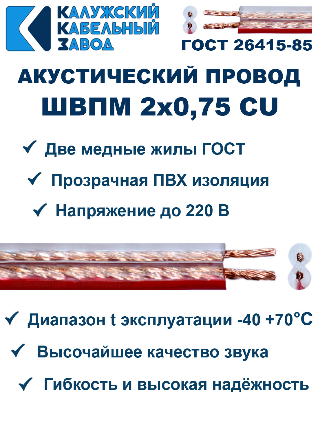 Акустический провод швпм 2х0,75, 10 метров, ГОСТ, Калужский кабельный завод. информация:
