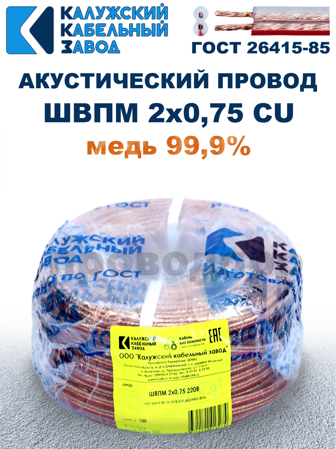 Акустический провод швпм 2х0,75, 30 метров, ГОСТ, Калужский кабельный завод. информация: