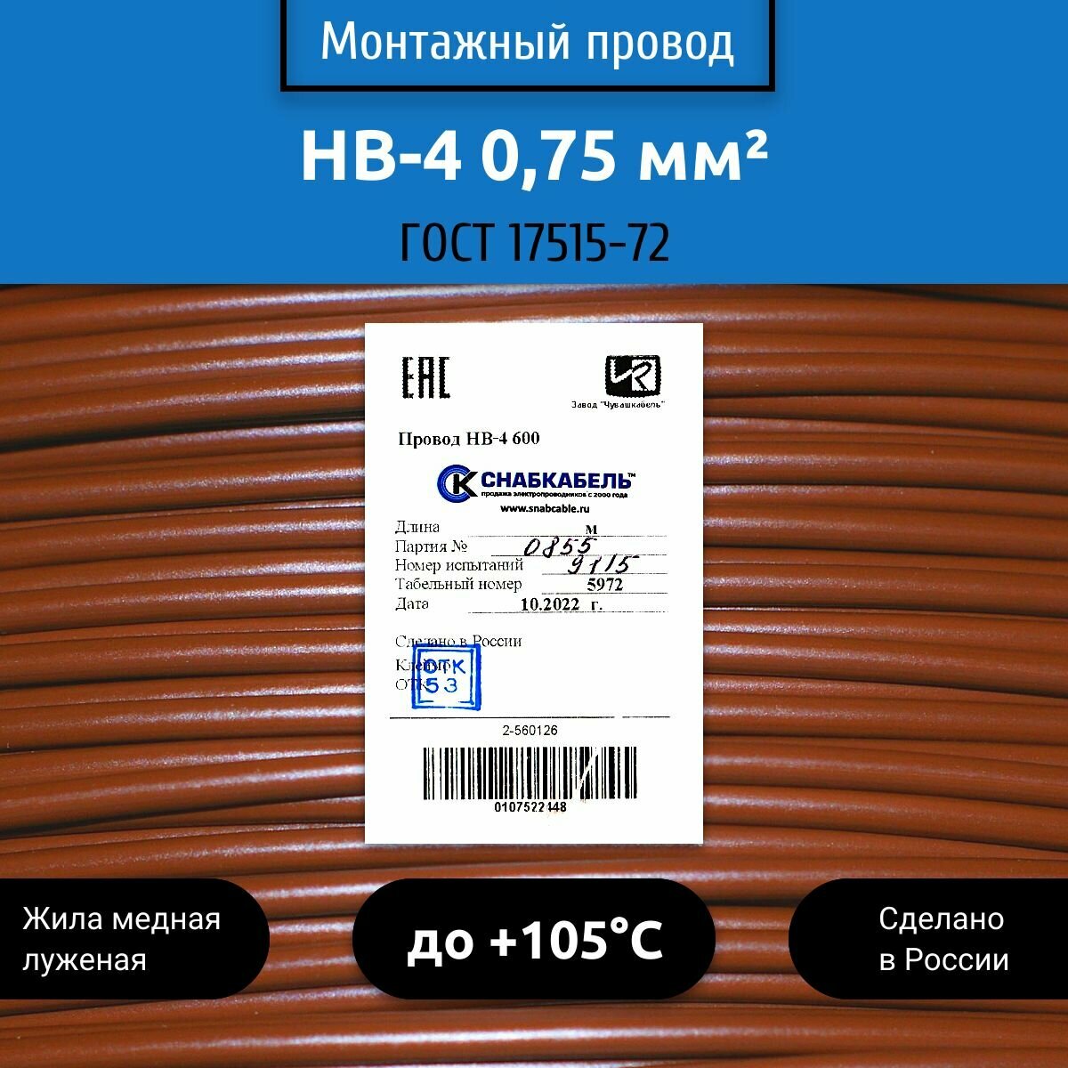 Электрический провод НВ 1,00мм2 4х600В 100 м коричневый на катушке 4 269 ₽