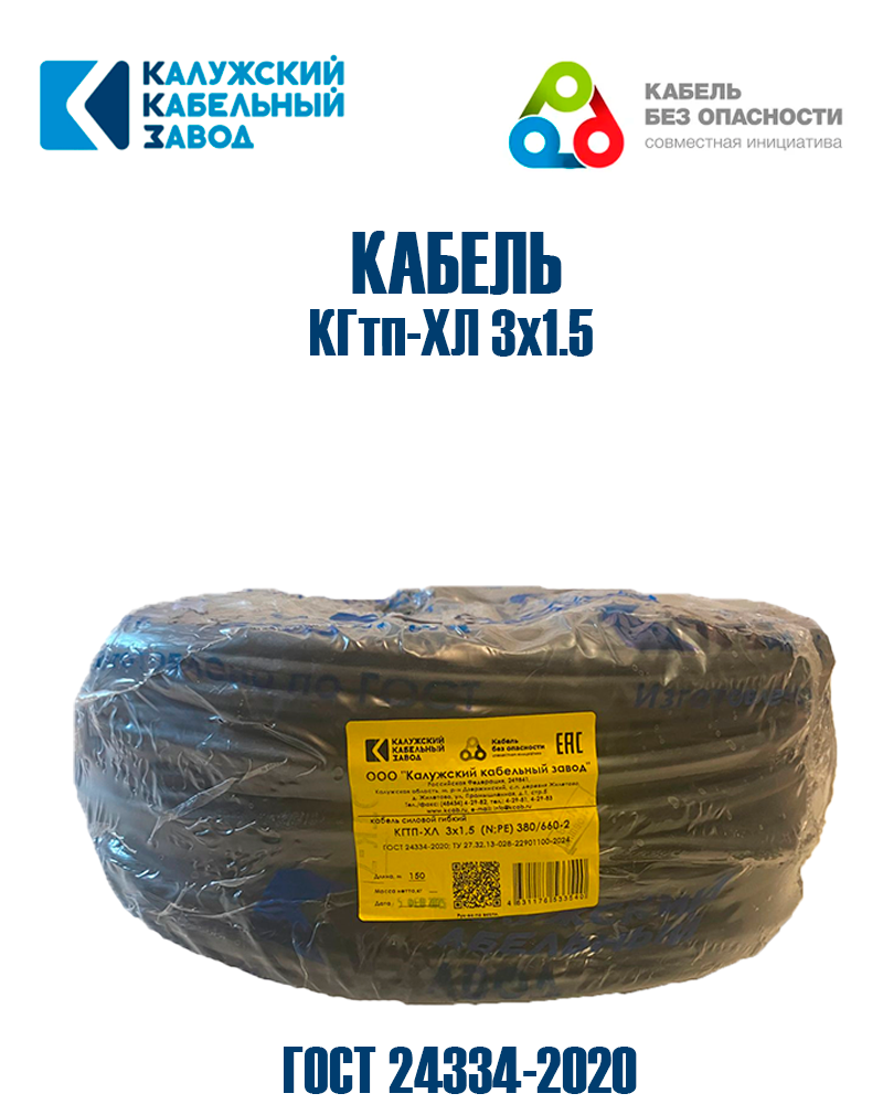 Кабель морозостойкий КГтп-ХЛ ГОСТ 3x1,5 ГОСТ Калужский кабельный завод, 15 м. информация: