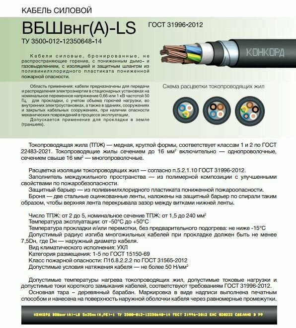 Кабель бронированный ВБШв нг(А)-LS 3х4 (N, PE) 150м Конкорд информация: