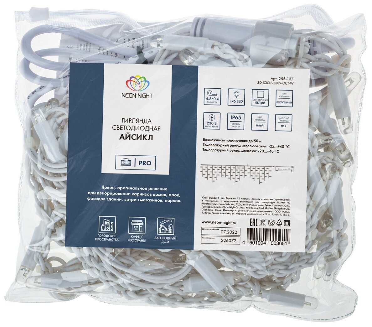 Гирлянда "Айсикл" (бахрома) 4.8х0.6м 176LED бел. 11Вт 230В IP65 провод бел. | код 255-137 | Neon-Night ( 1упак. ) 7 026 ₽