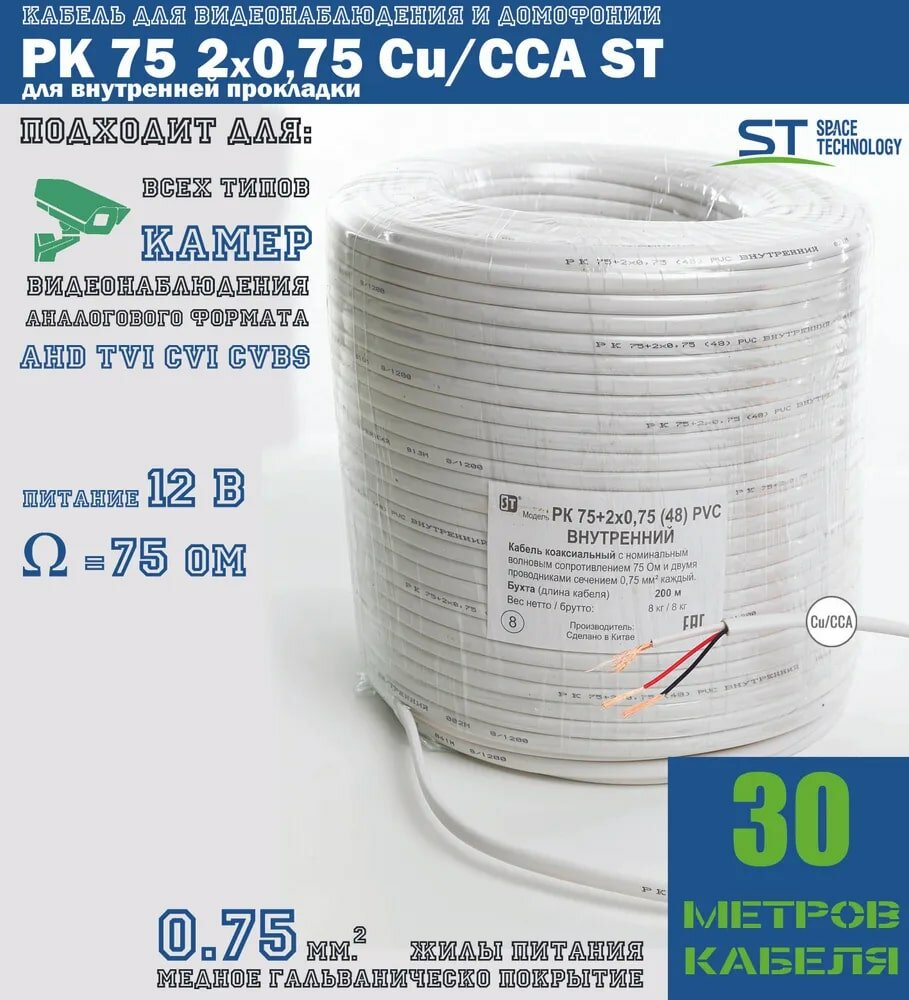 Кабель комбинированный для видеонаблюдения и домофонии КВК-В 2Х0,75 (РК 75+2х0,75 (48) PVC ST) белый для внутренней прокладки (помещение) (бухта 30м) информация: