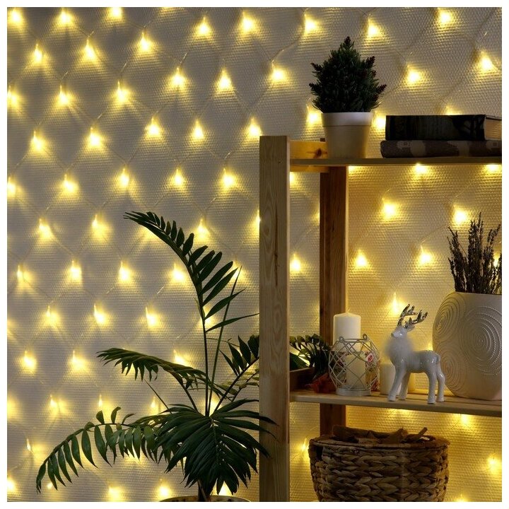 10 цен на Гирлянда "Сеть" 1.6 x 1.6 м, IP20, прозрачная нить, 144 LED, свечение тёплое белое, 8 режимов, 220 В
