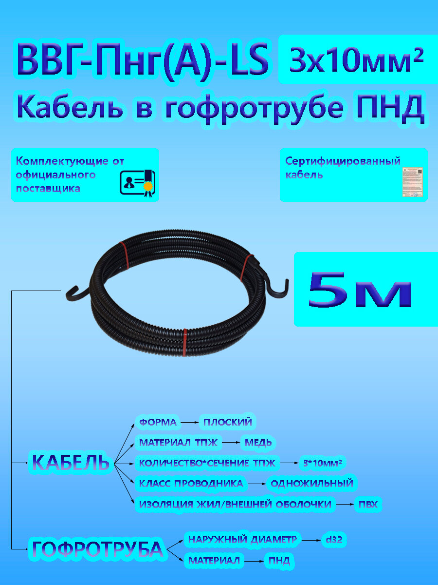Кабель ВВГ-Пнг(А)-LS 3х10 ОК 0,66 кВ ГОСТ в черной гофротрубе ПНД d32 (5 м) универсальный L-фаза информация: