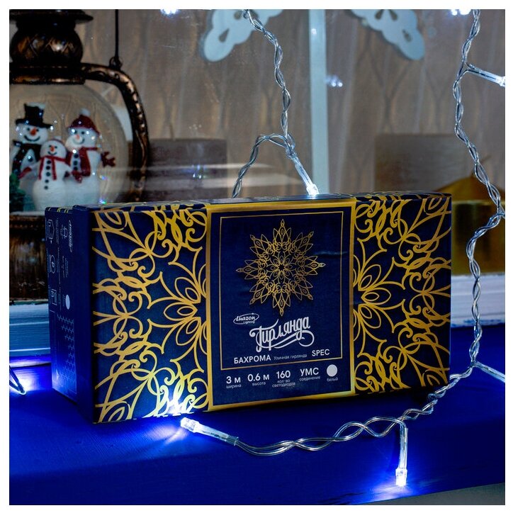 Гирлянда «Бахрома» 3 × 0.6 м, IP44, УМС, белая нить, 160 LED, свечение белое, 220 В