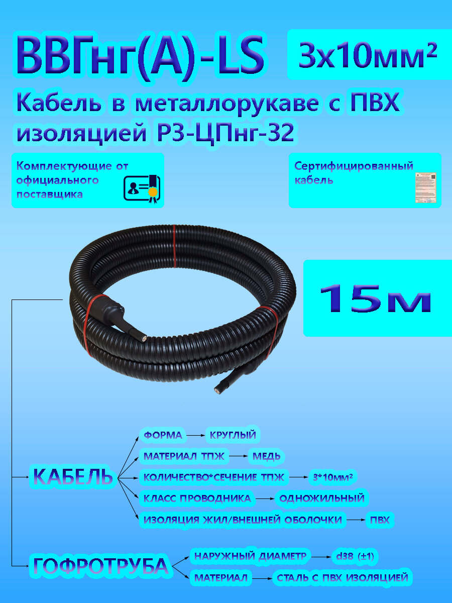 Кабель ВВГнг(А)-LS 3х10 ОК 0,66 кВ ГОСТ в металлорукаве с черной ПВХ изоляцией Р3-ЦПнг-32 d32 (15 м) универсальный L-фаза информация:
