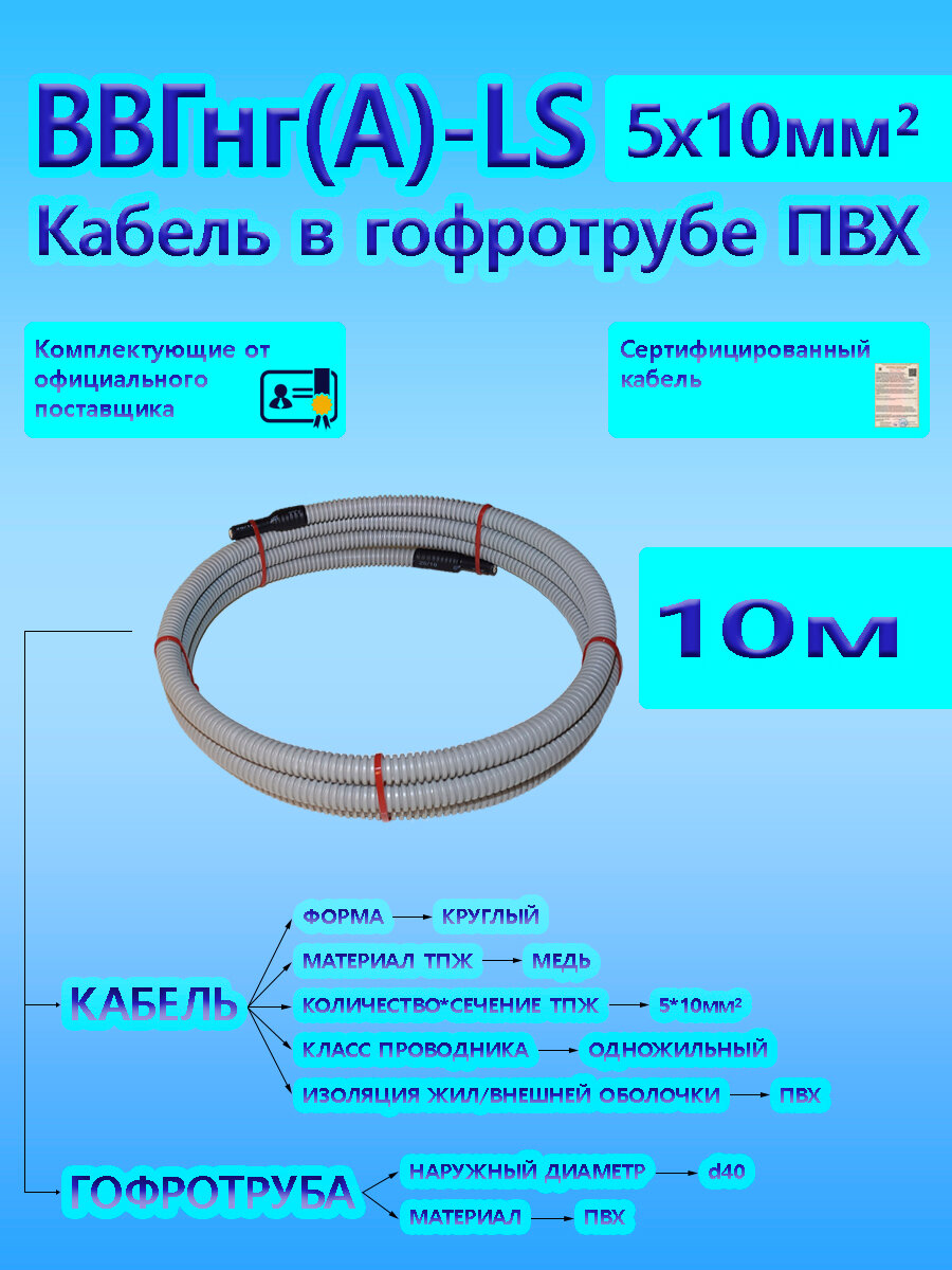 10 цен на Кабель ВВГнг(А)-LS 5х10 ОК 0,66 кВ ГОСТ в серой гофротрубе ПВХ d40 (10 м) универсальный L-фаза