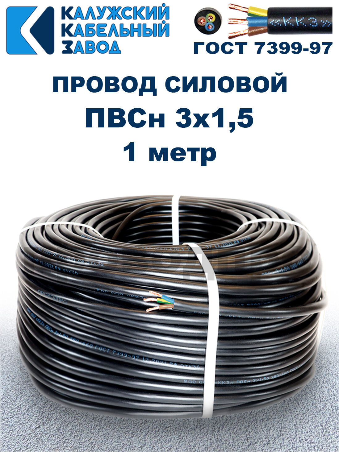 Провод ПВС 3х1,5 ГОСТ, 1 метр. Чёрный. Калужский кабельный завод информация: