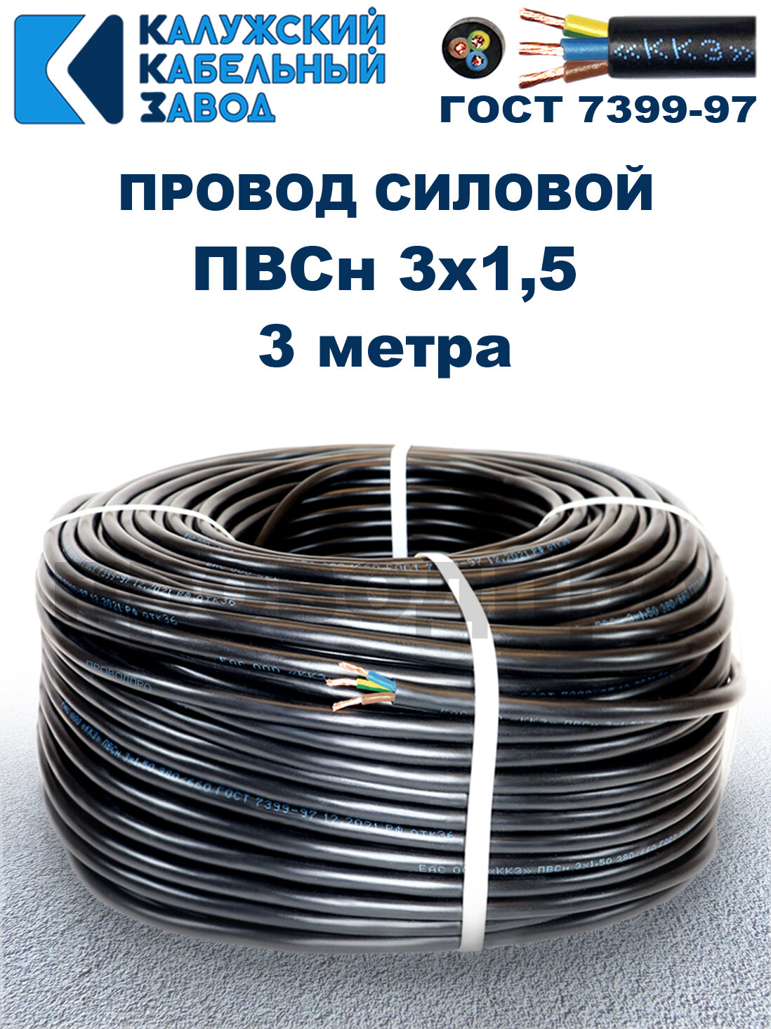 Провод ПВС 3х1,5 ГОСТ, 3 метра. Чёрный. Калужский кабельный завод информация: