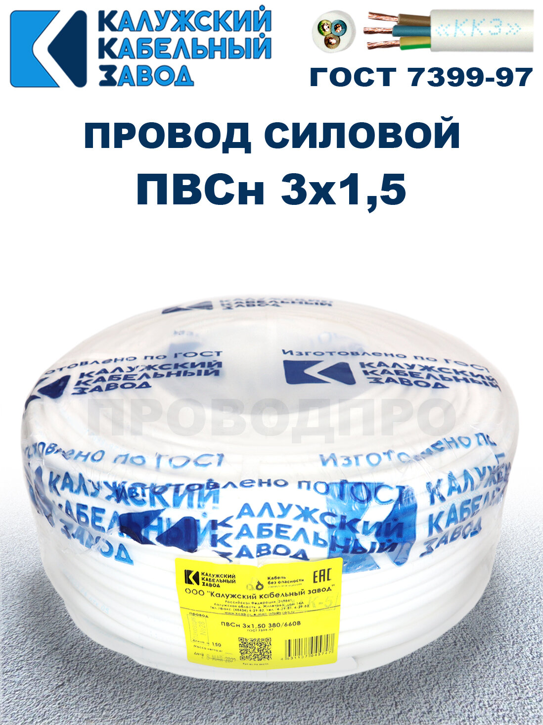 Провод ПВС 3х1,5 ГОСТ, 2 метра. Белый. Калужский кабельный завод информация: