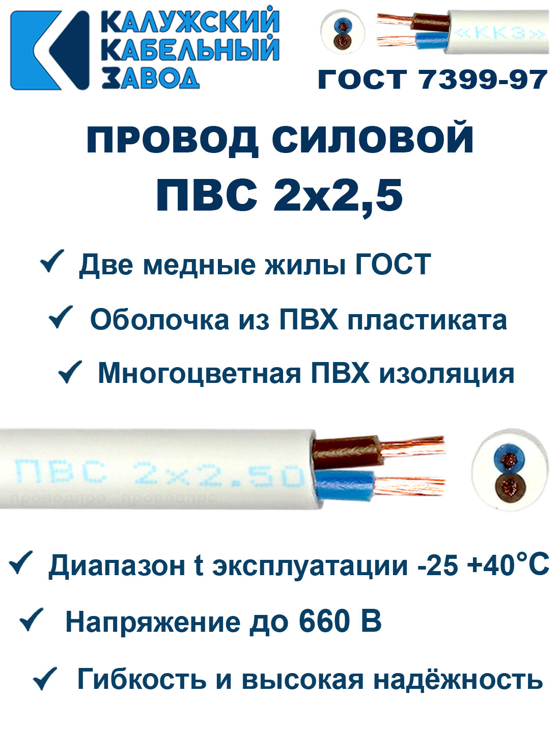 Провод ПВС 2х2,5 ГОСТ, 7 метров. Белый. Калужский кабельный завод информация: