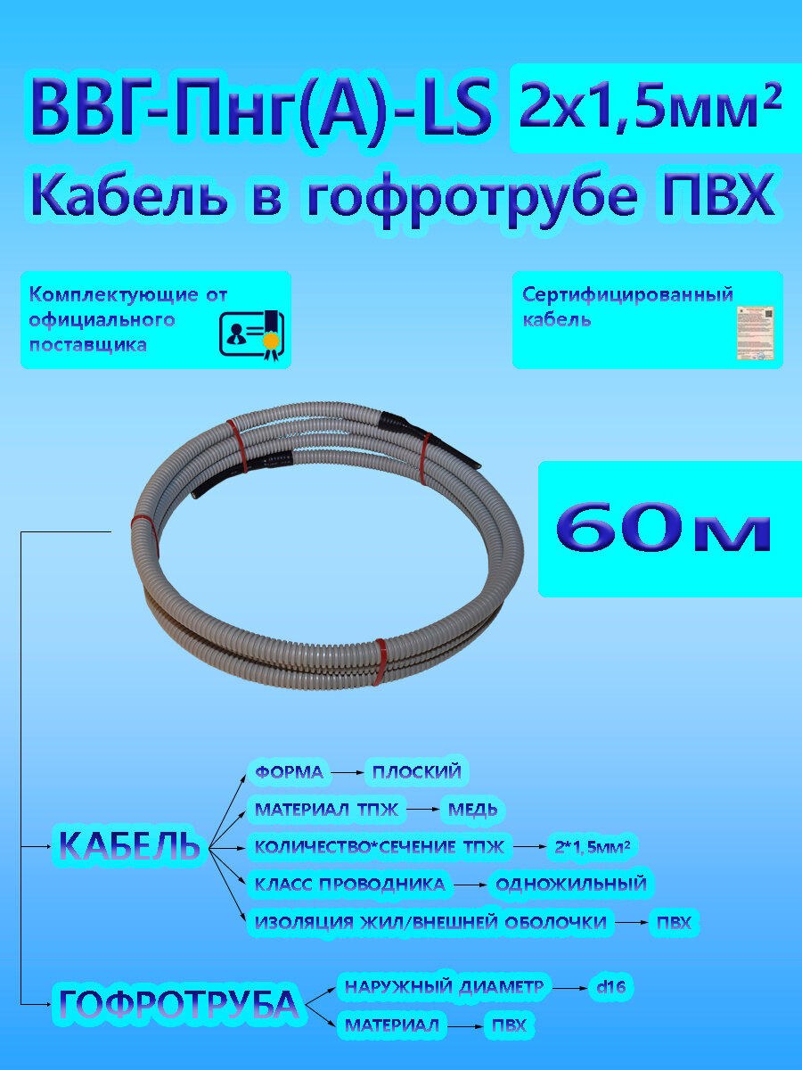 Кабель ВВГ-Пнг(А)-LS 2х1,5 ОК 0,66 кВ ГОСТ в серой гофротрубе ПВХ d16 (60 м) универсальный L-фаза информация: