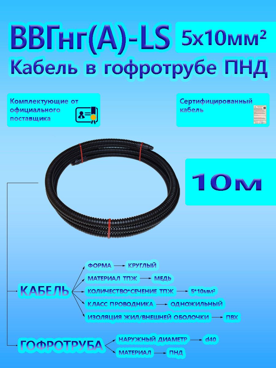 Кабель ВВГнг(А)-LS 5х10 ОК 0,66 кВ ГОСТ в черной гофротрубе ПНД d40 (10 м) универсальный L-фаза информация: