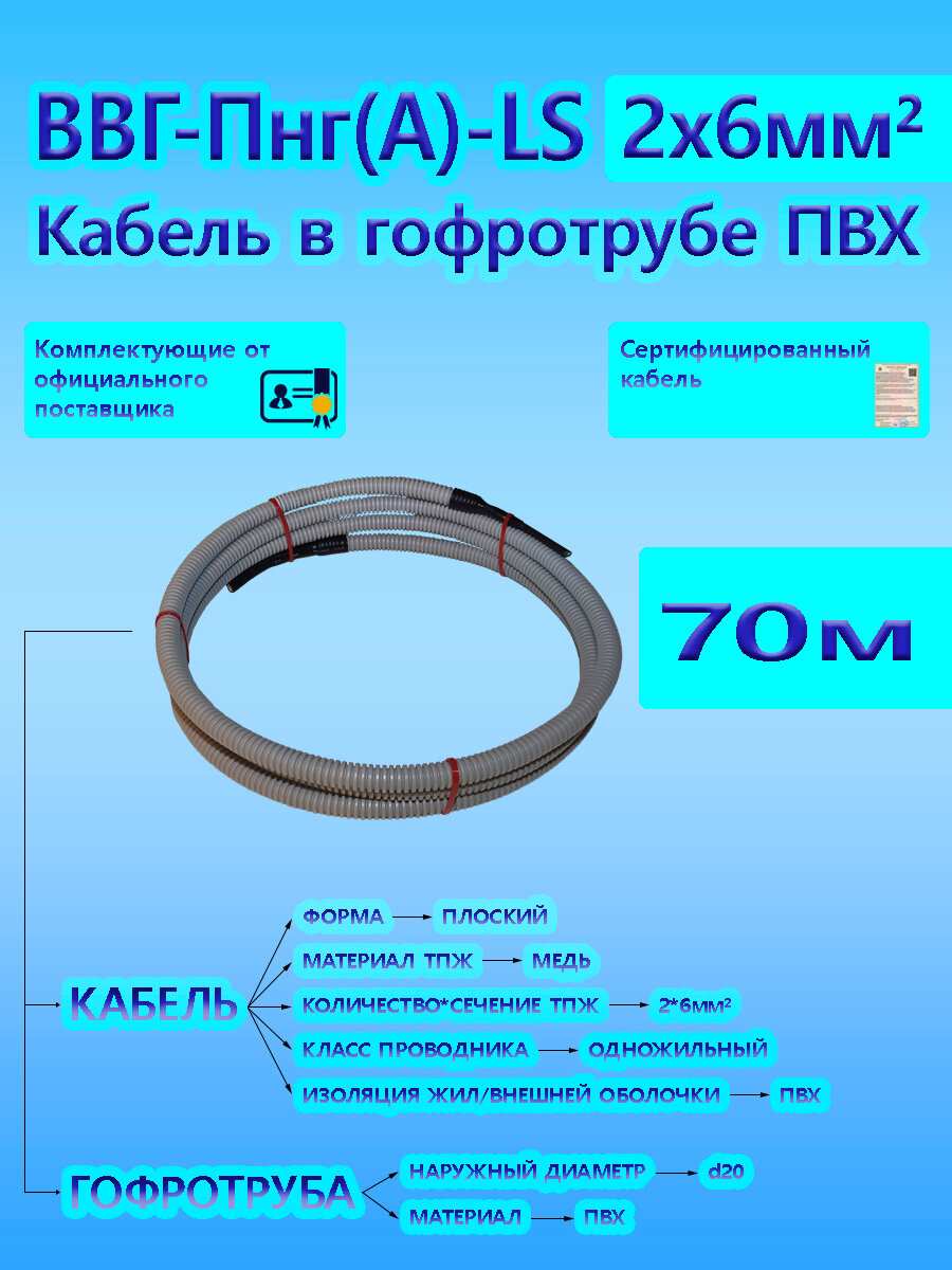 Отзывы на Кабель ВВГ-Пнг(А)-LS 2х6 ОК 0,66 кВ ГОСТ в серой гофротрубе ПВХ d20 (70 м) универсальный L-фаза