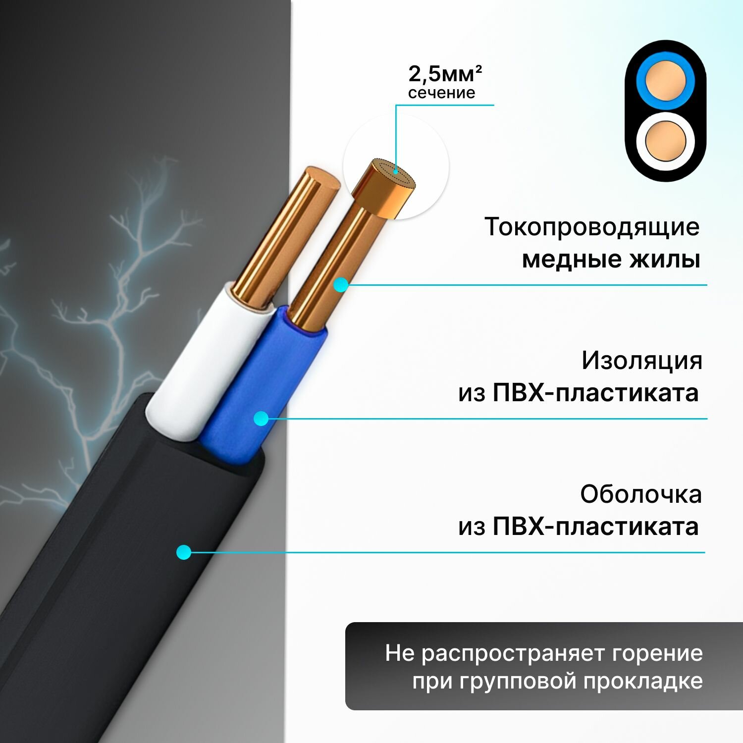 Силовой кабель рэмкабель ВВГ-Пнг(А)-LS 2х2.5 черный ГОСТ плоский 20 м 3 322 ₽
