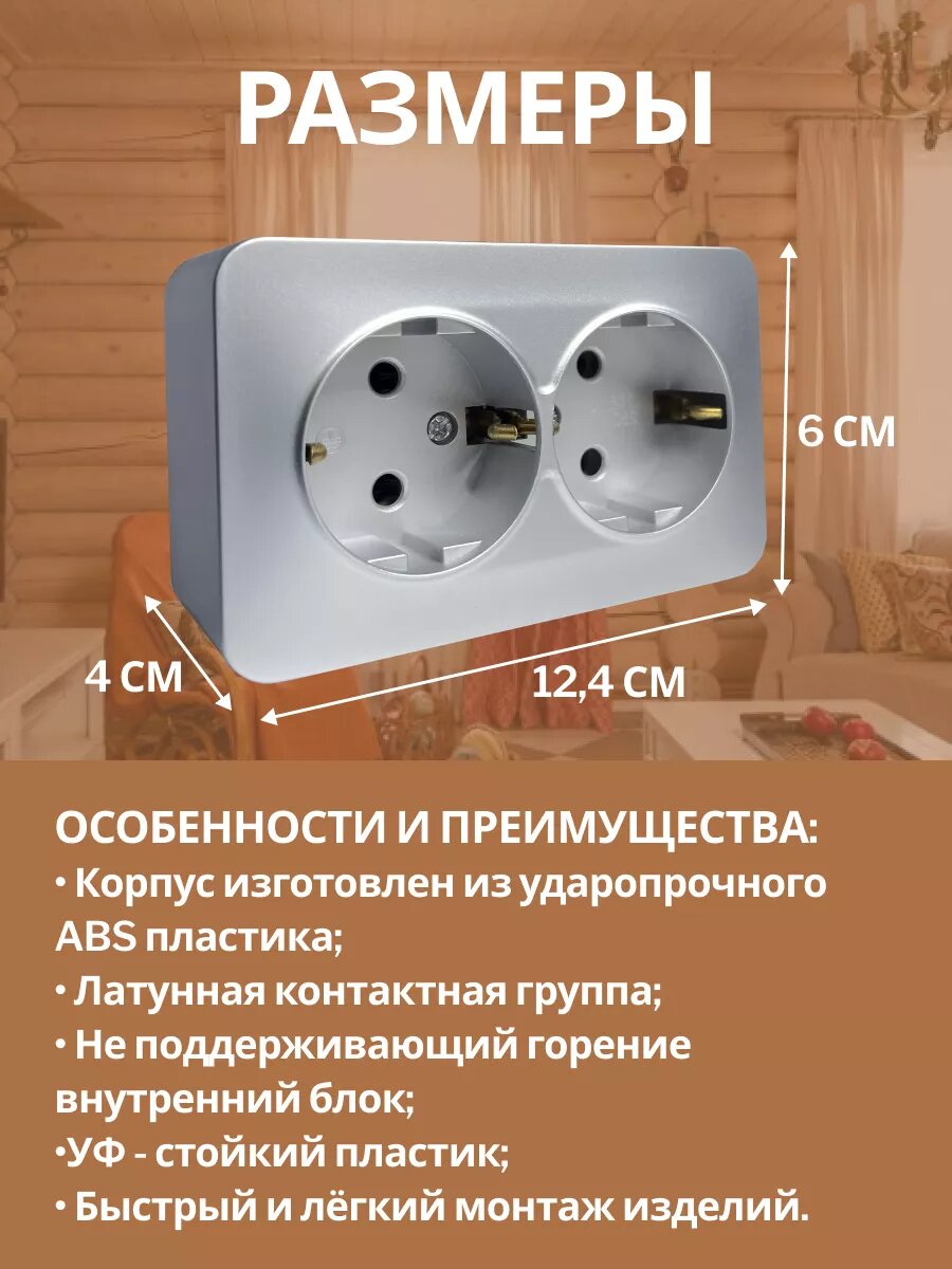 Розетка накладная STEKKER София, 2 гнезда, с заземлением, IP20, серебро информация:
