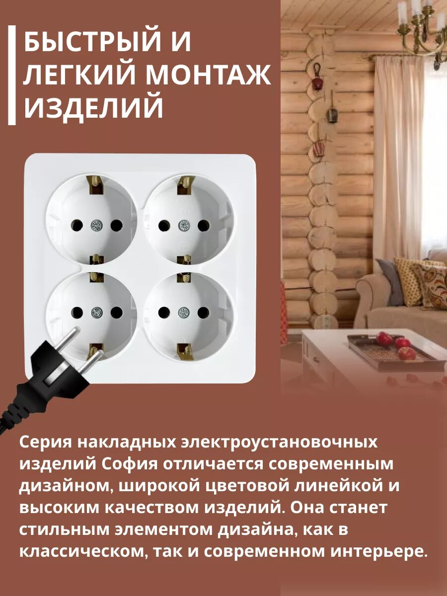 Розетка накладная STEKKER София, 4 гнезда, с заземлением, IP20, белый информация: