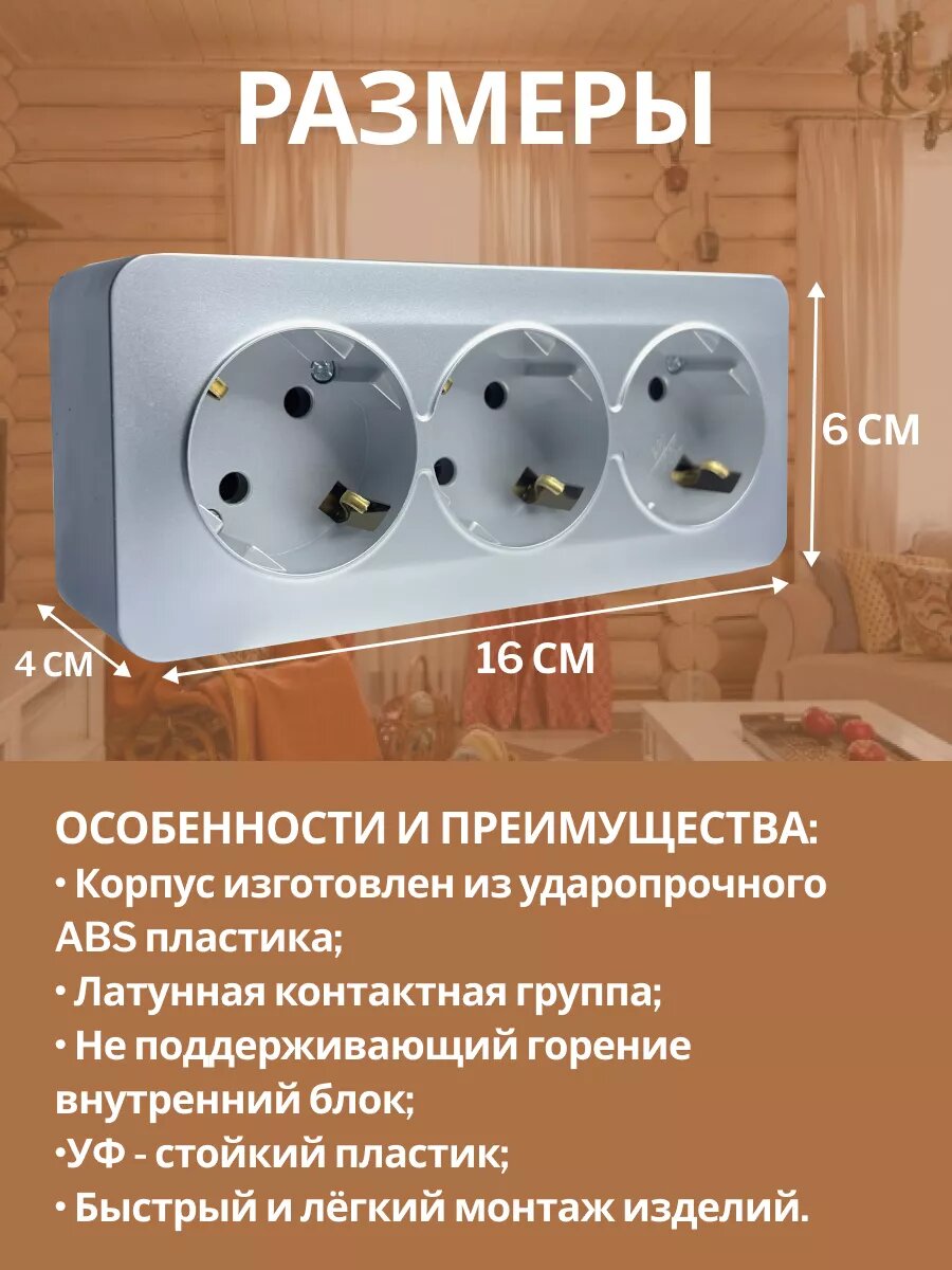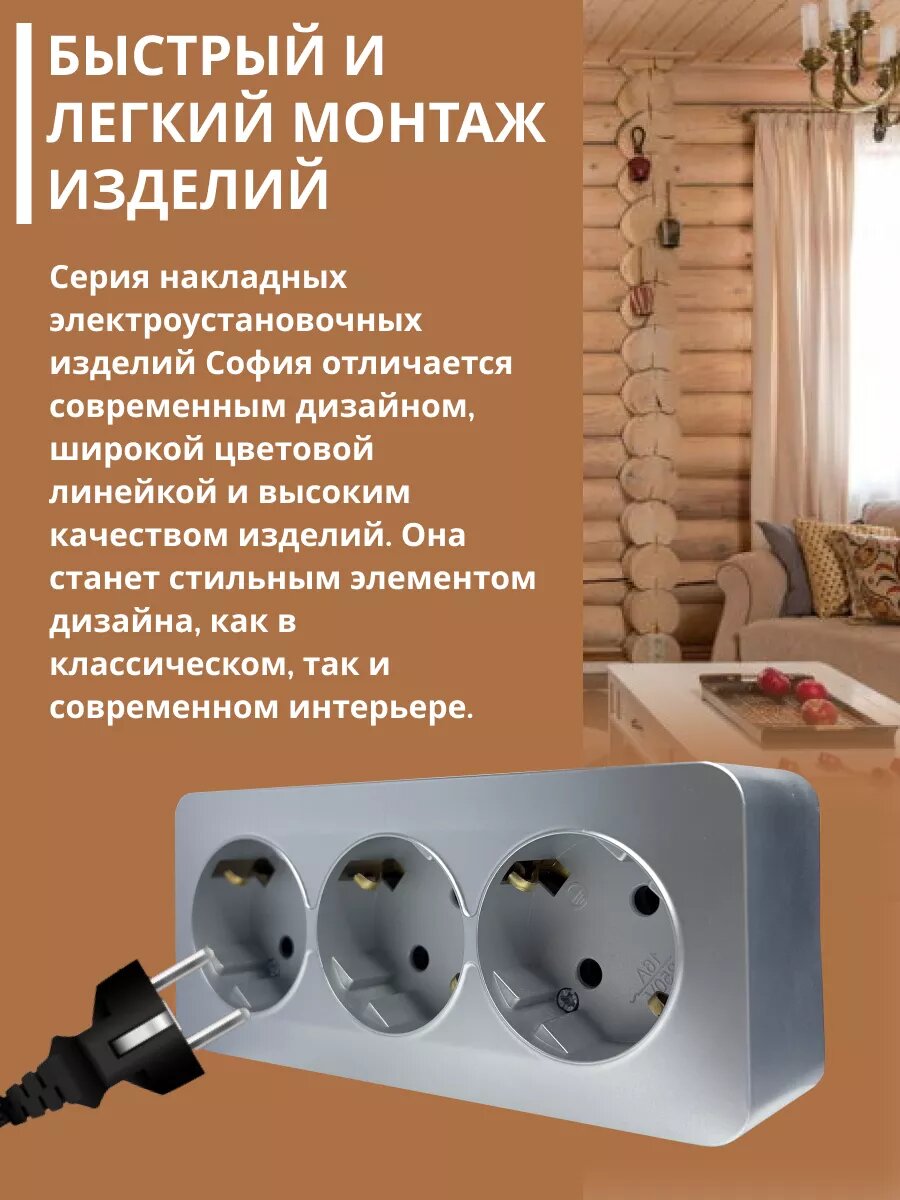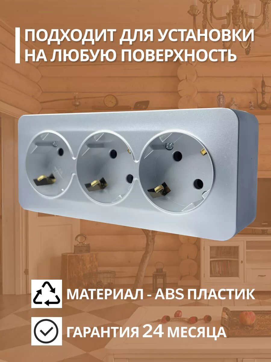 Розетка накладная STEKKER София, 3 гнезда, с заземлением, IP20, серебро информация: