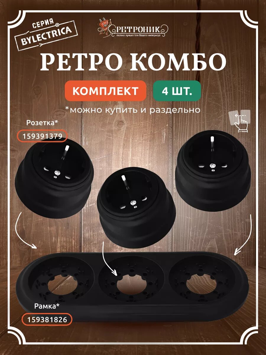 Ретро розетка 3 шт и тройная рамка, комплект черный, Bylectrica информация: