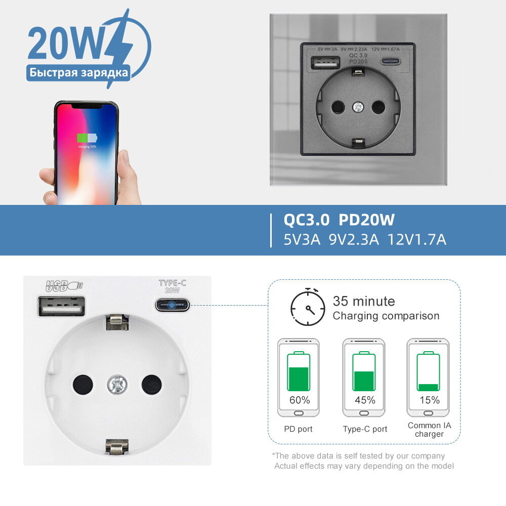 10 цен на Розетка одинарная с USB и type-C входами, с быстрой зарядкой, рамка стекло Серая