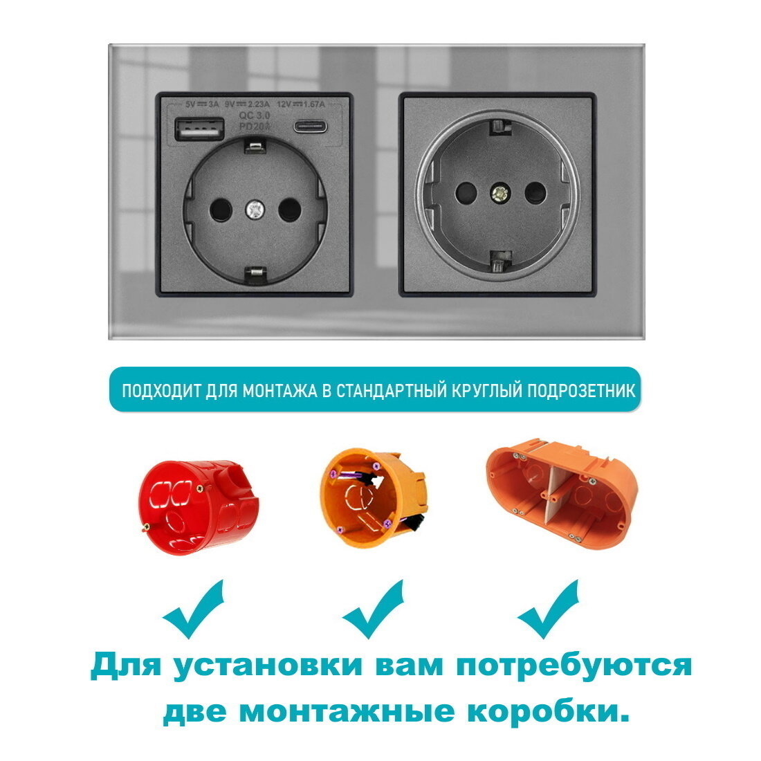 10 цен на Розетка двойная 2 поста с USB и type-C входами, с быстрой зарядкой, рамка стекло, цвет серый