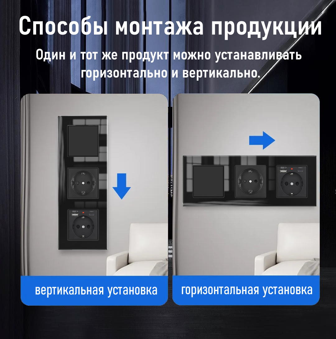 Отзывы на Одноклавишный выключатель с двойной розеткой и 2-мя USB и Type-C, рамка стекло, цвет чёрный.