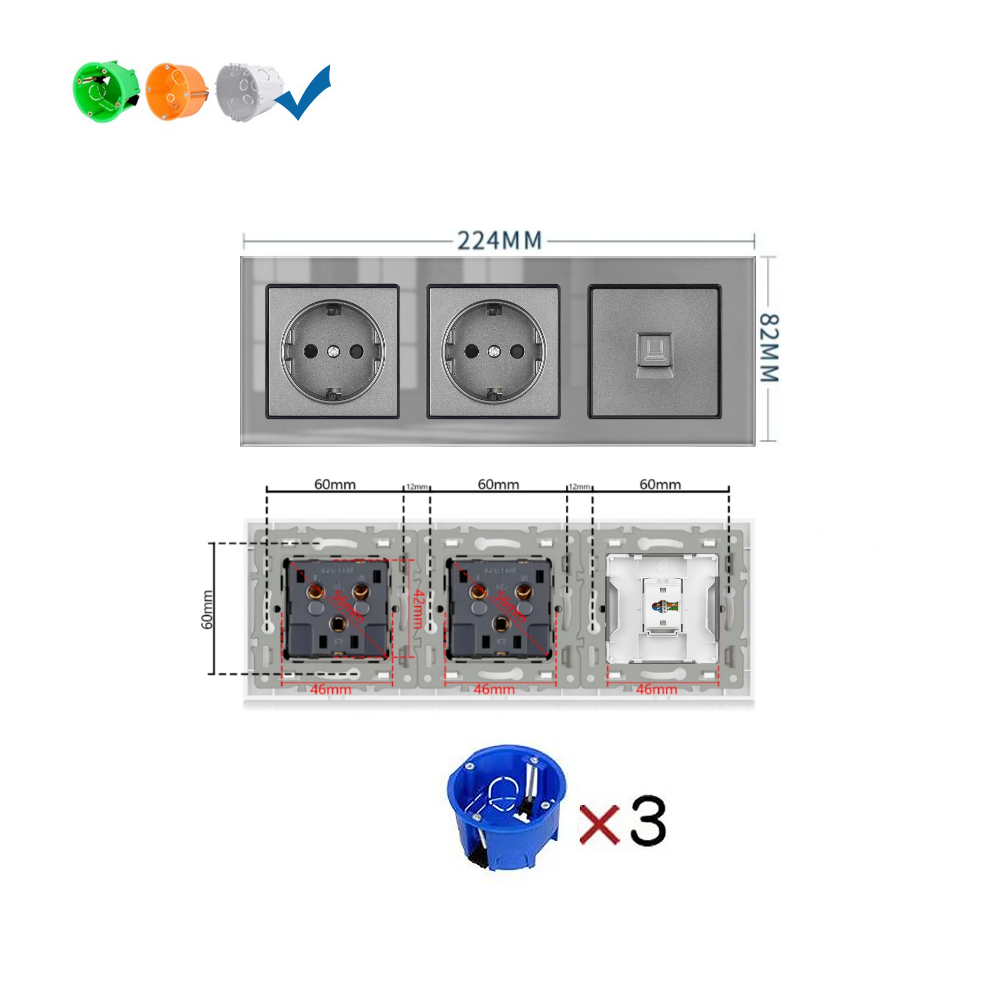 Отзывы на Розетка тройная с интернетом RJ-45 CAT6, 3 поста, рамка стекло, 224х82х8 мм, цвет серый