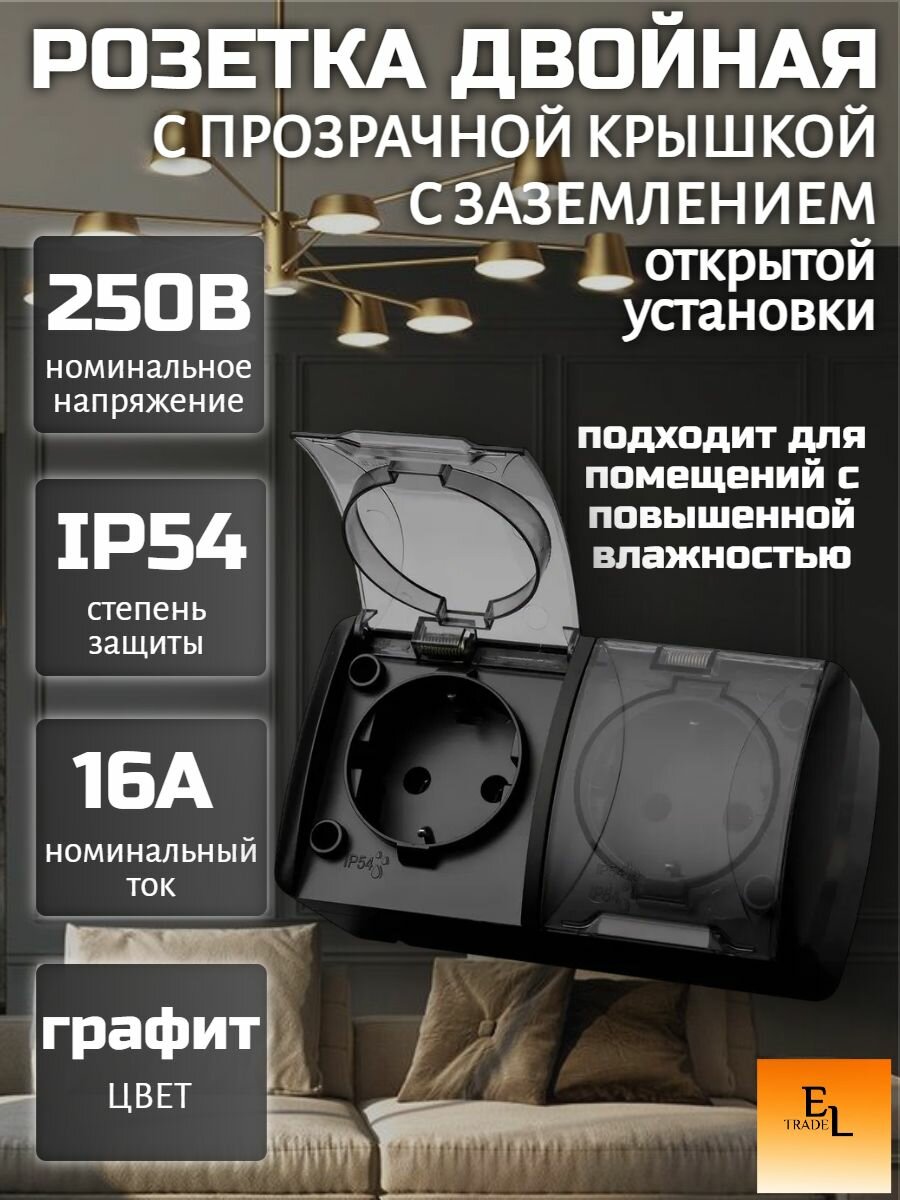 Отзывы на Розетка двойная открытой установки с заземлением с крышкой графит 2П, 16А, IP54, Селигер